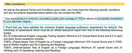 以昆士兰大学conditional offer为例,如下的截图里,XX学生的offer conditions有三条:A. 完成本科课程并达到加权均分75%(意味着学生要补充完整成绩单、毕业证和学位证,提供公证件)B. 满足学校的语言条件 C. 学位证的清华认证报告(XX学生所就读的学校为非211院校,故有此项condition)