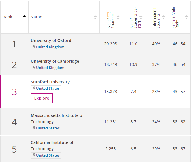 今年的前五名分别是牛津大学、剑桥大学、斯坦福大学、麻省理工大学、加州理工大学。第六到第十名分别是哈佛大学、普林斯顿大学、耶鲁大学、伦敦帝国理工学院、芝加哥大学。