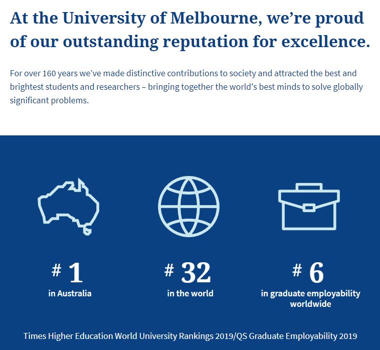 今年跟去年一样,也是有6所澳洲大学进入了榜单的前100名澳洲地区的榜首是墨尔本大学,排在世界第32名;而这已经是墨尔本大学连续8年蝉联这一荣誉了!墨大的小伙伴们可以得瑟一下。。。